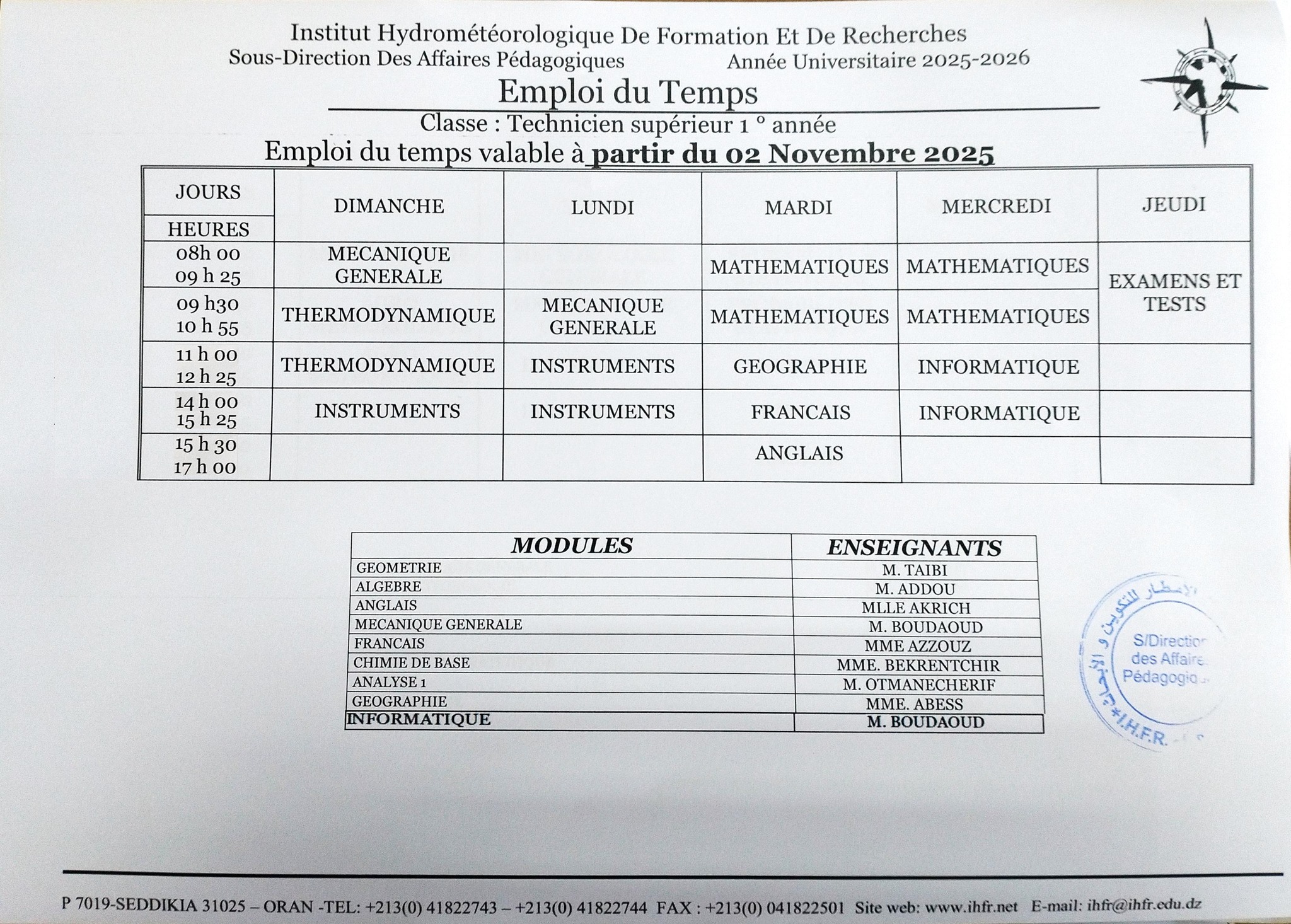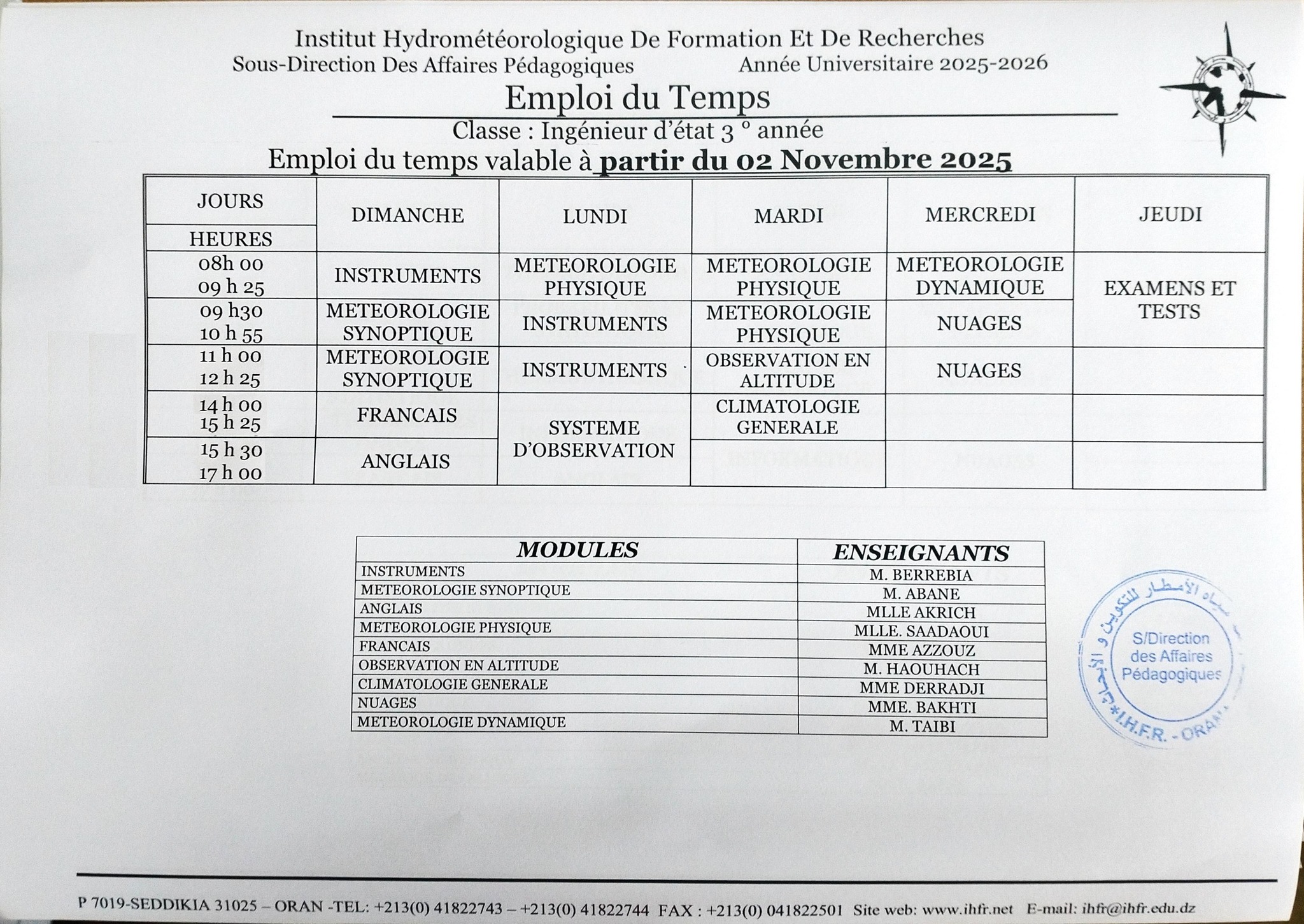 | 08h00 - 09h25 | INSTRUMENTS | METEOROLOGIE PHYSIQUE | METEOROLOGIE PHYSIQUE | METEOROLOGIE DYNAMIQUE | EXAMENS ET TESTS |