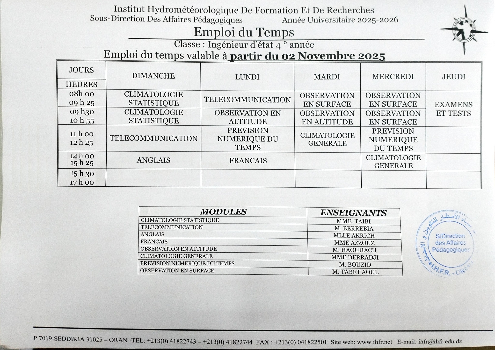 | 08h00 - 09h25 | CLIMATOLOGIE STATISTIQUE | TELECOMMUNICATION | OBSERVATION EN SURFACE | OBSERVATION EN SURFACE | EXAMENS ET TESTS |