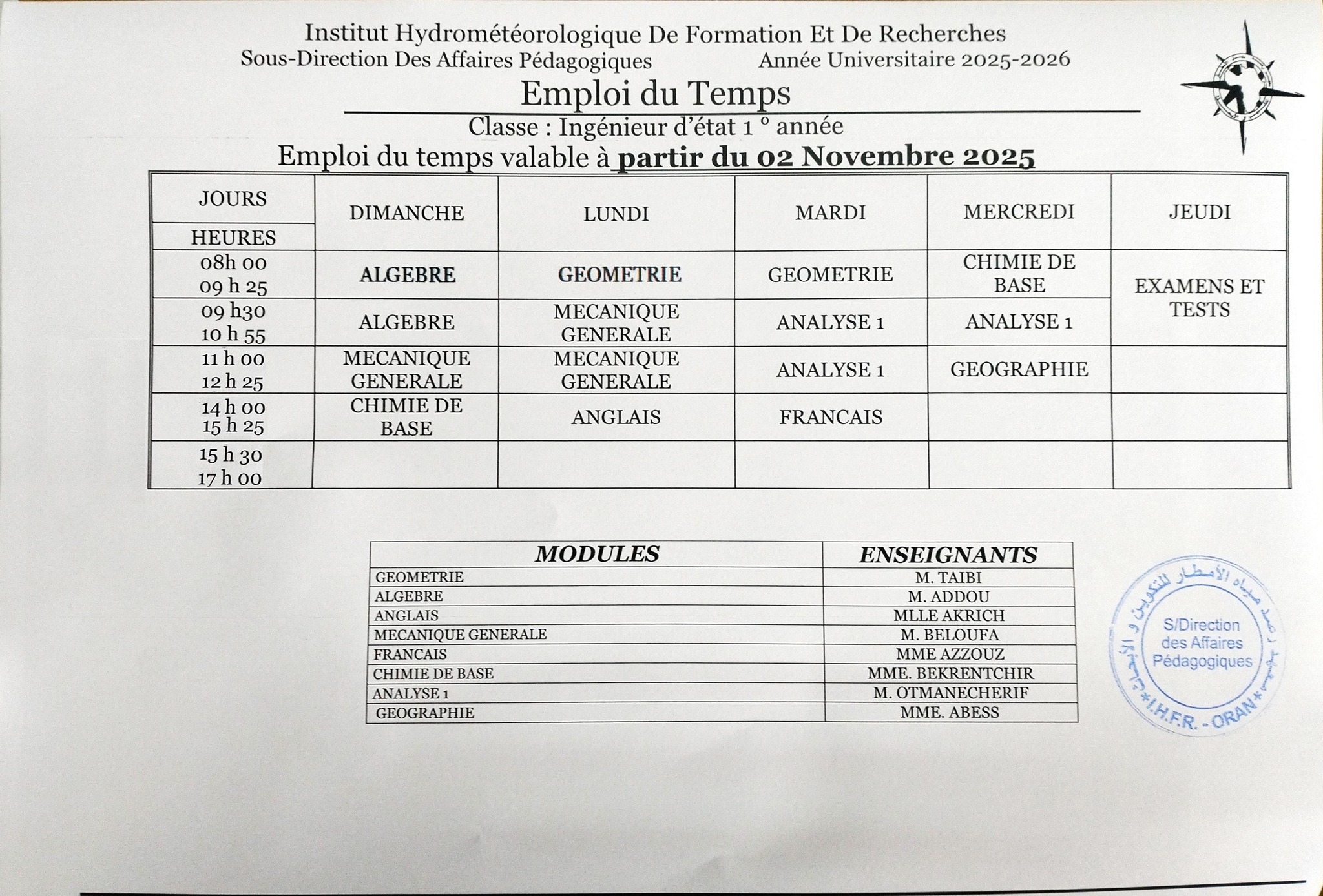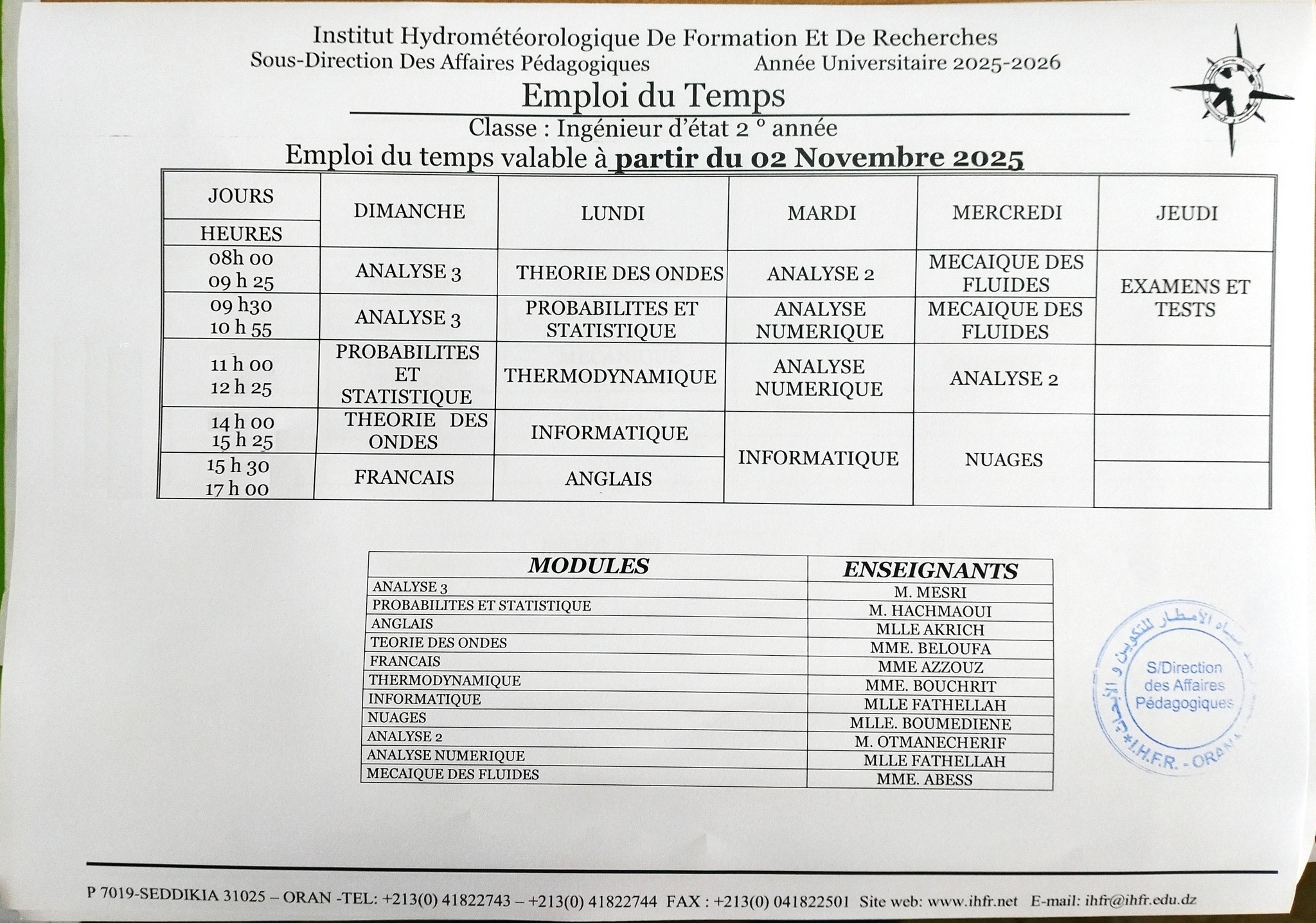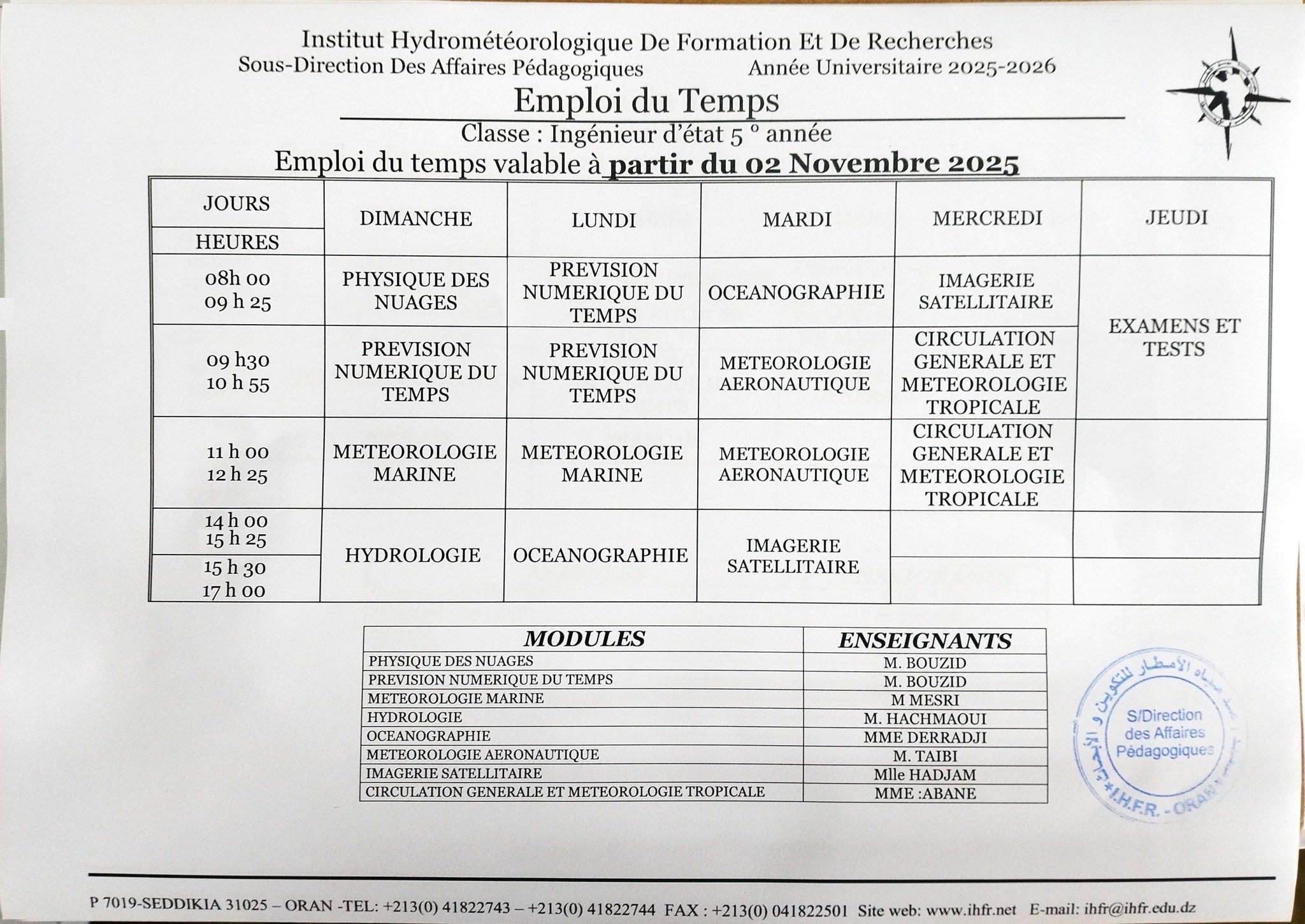 | 08h00 - 09h25 | INSTRUMENTS | METEOROLOGIE PHYSIQUE | METEOROLOGIE PHYSIQUE | METEOROLOGIE DYNAMIQUE | EXAMENS ET TESTS |
