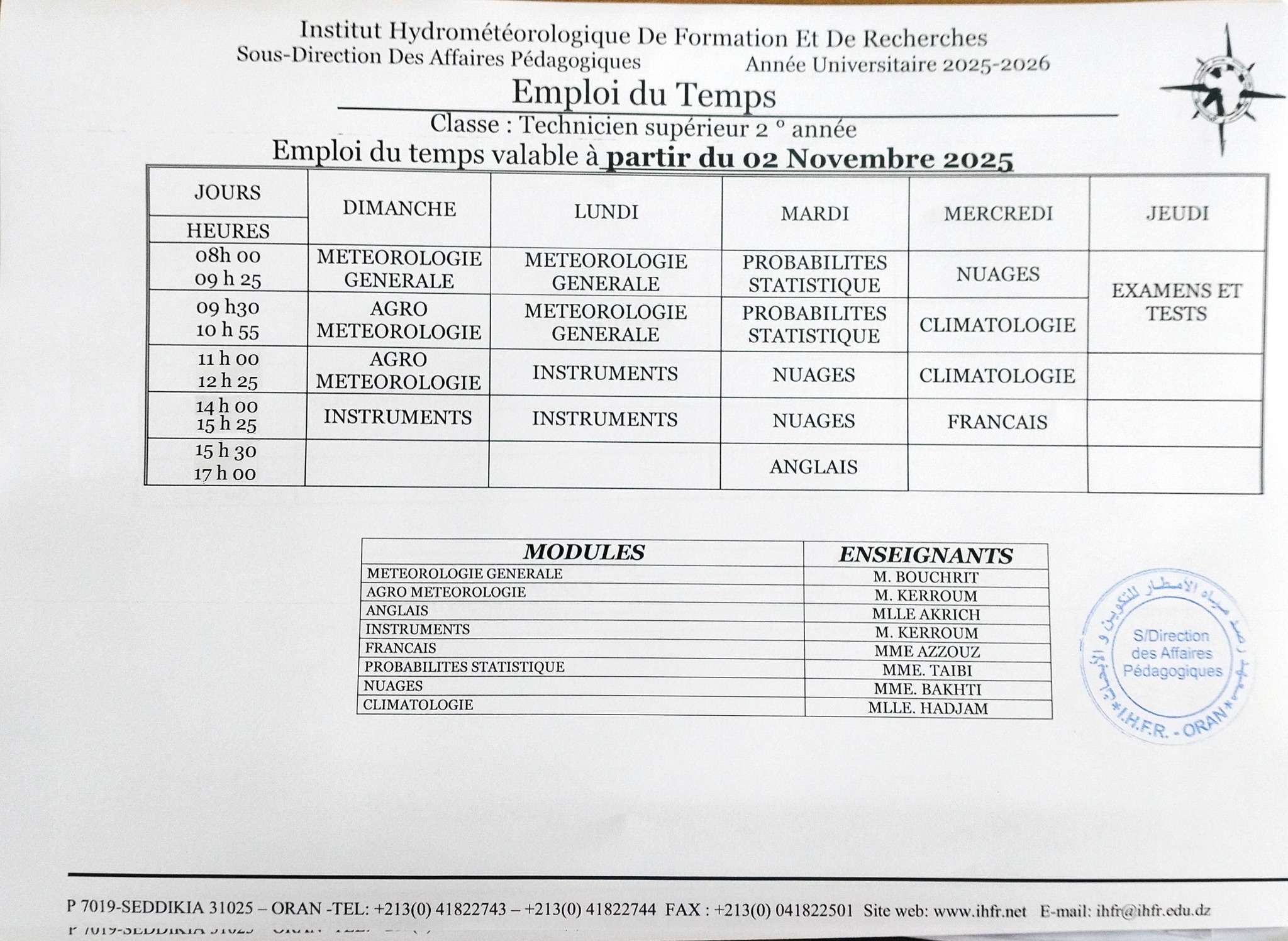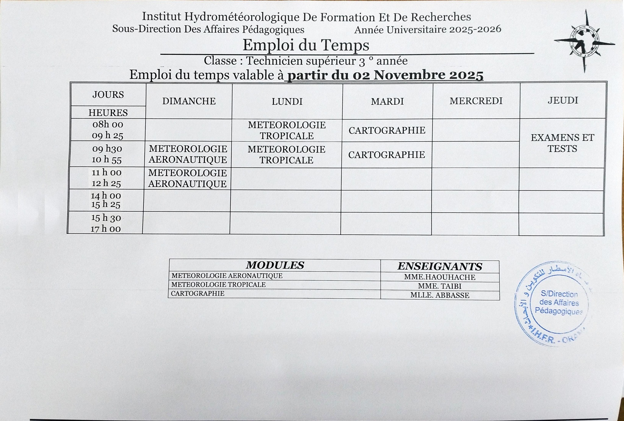 | 08h00 - 09h25 | CLIMATOLOGIE STATISTIQUE | TELECOMMUNICATION | OBSERVATION EN SURFACE | OBSERVATION EN SURFACE | EXAMENS ET TESTS |